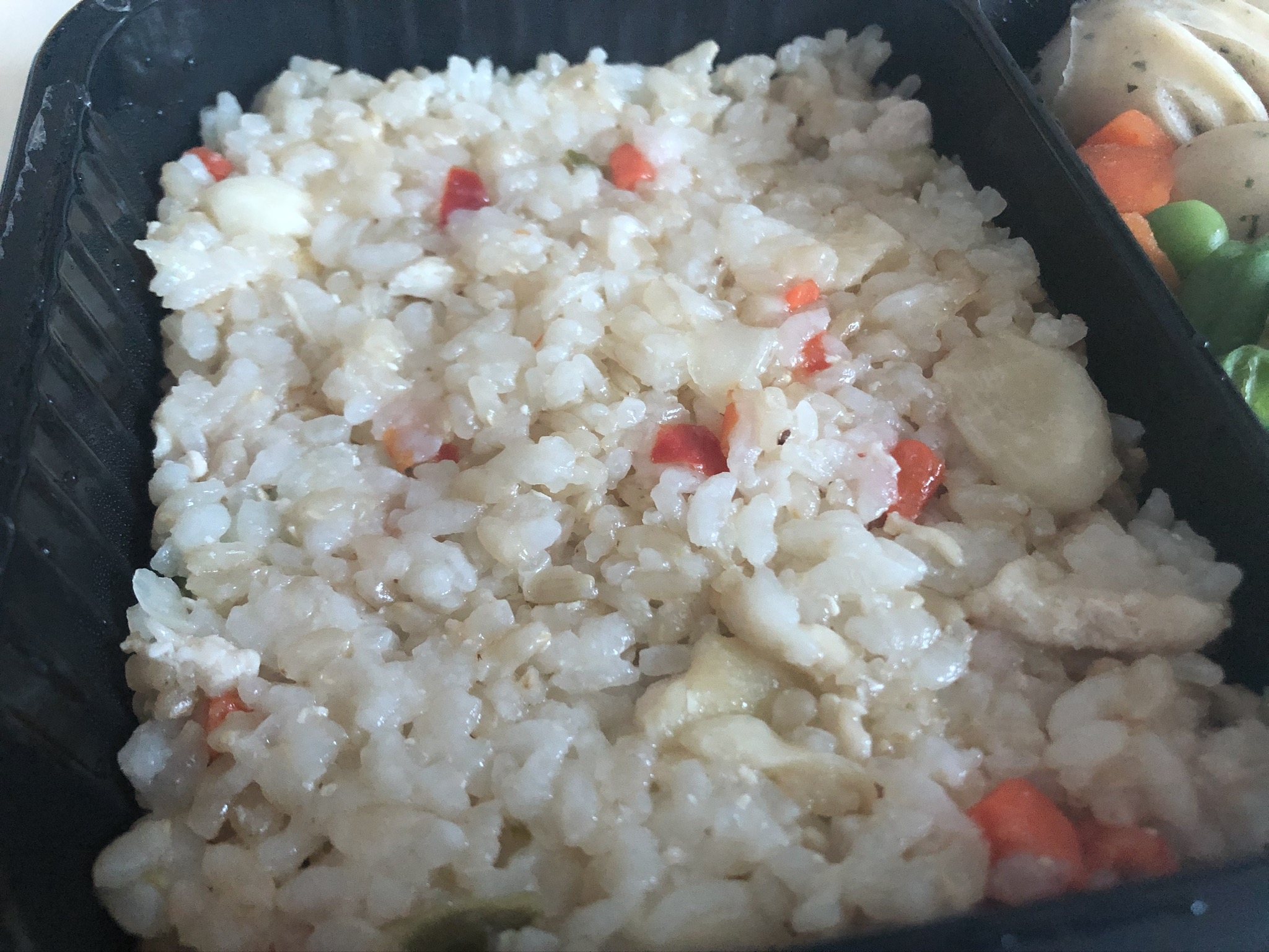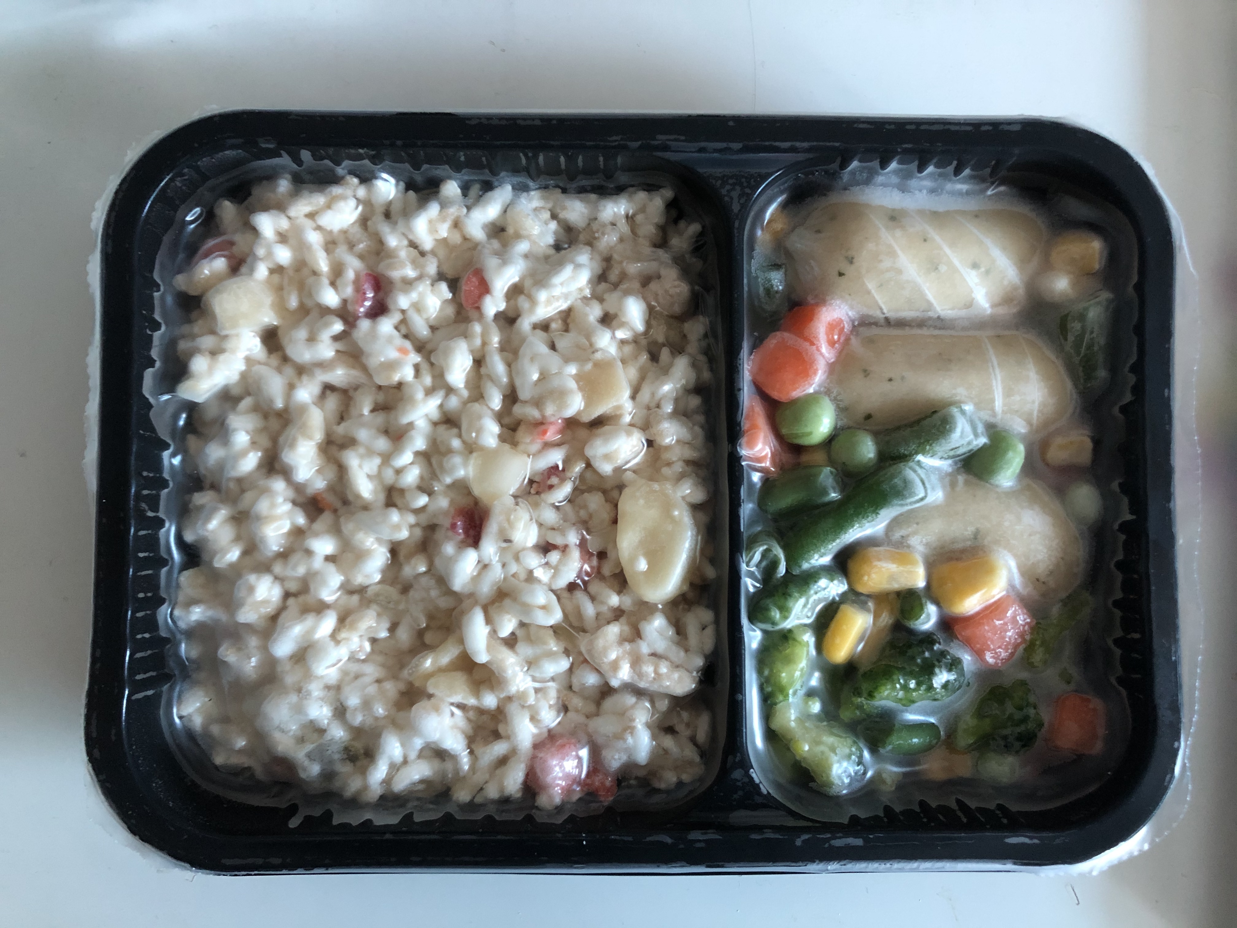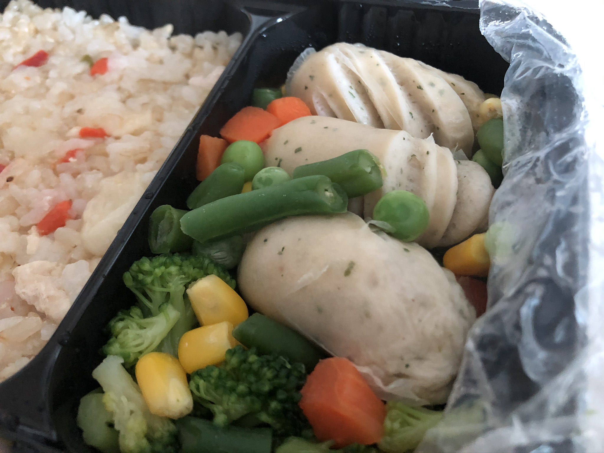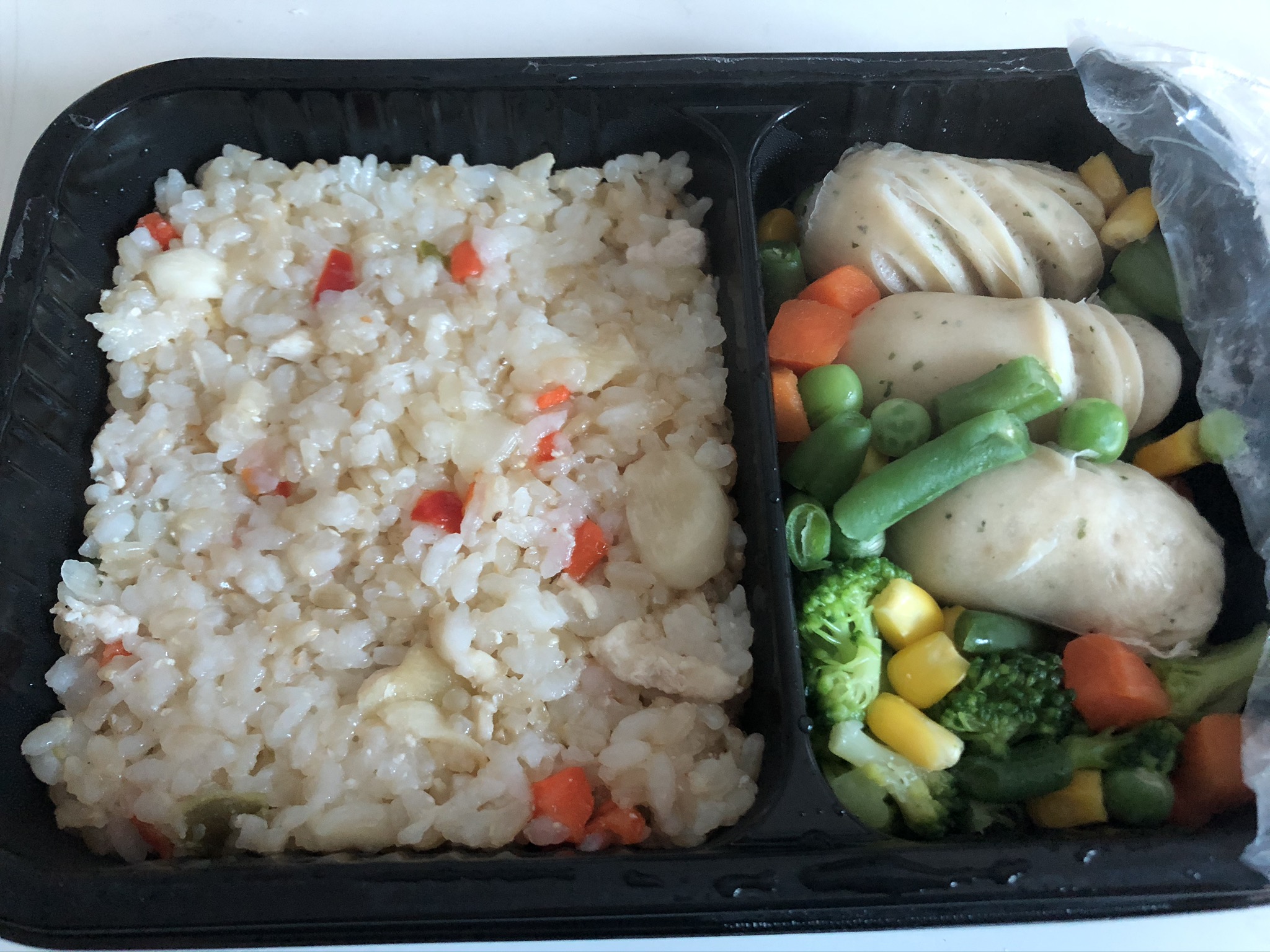 닭가슴살 마늘 볶음밥이라더니 마늘 칩이 좀 보이고, 소세지와 스팀야채가 함께 들어있다.
