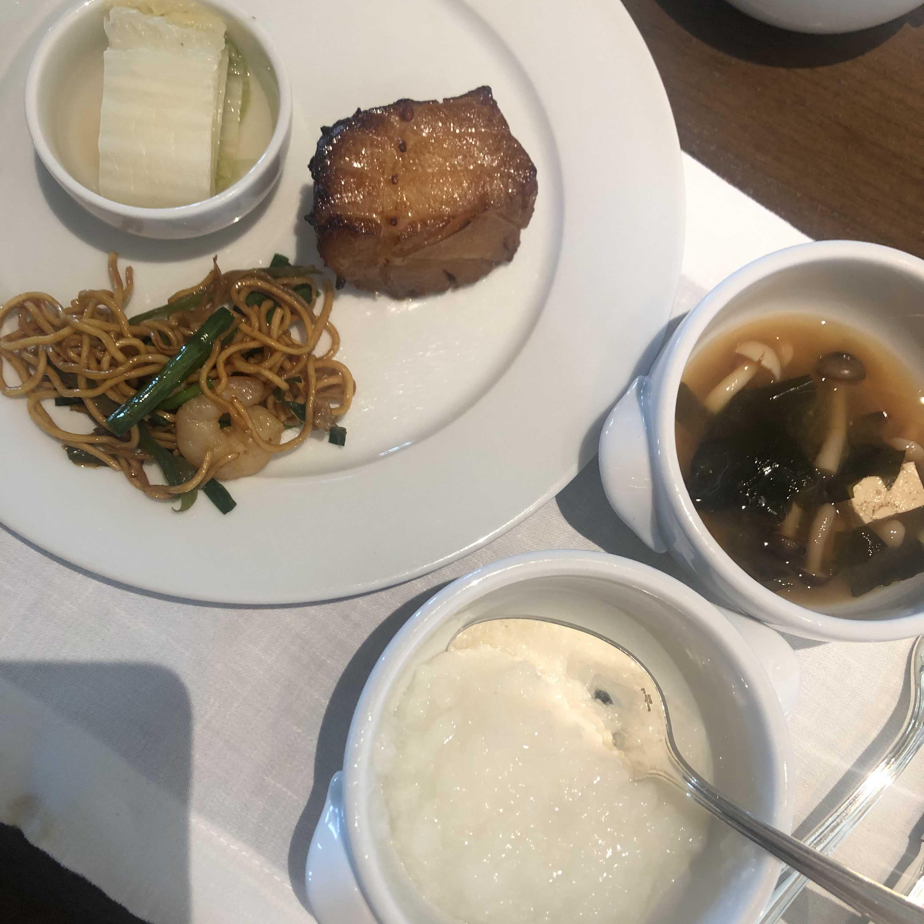 흰쌀죽과 미소장국, 백김치와 생선구이.