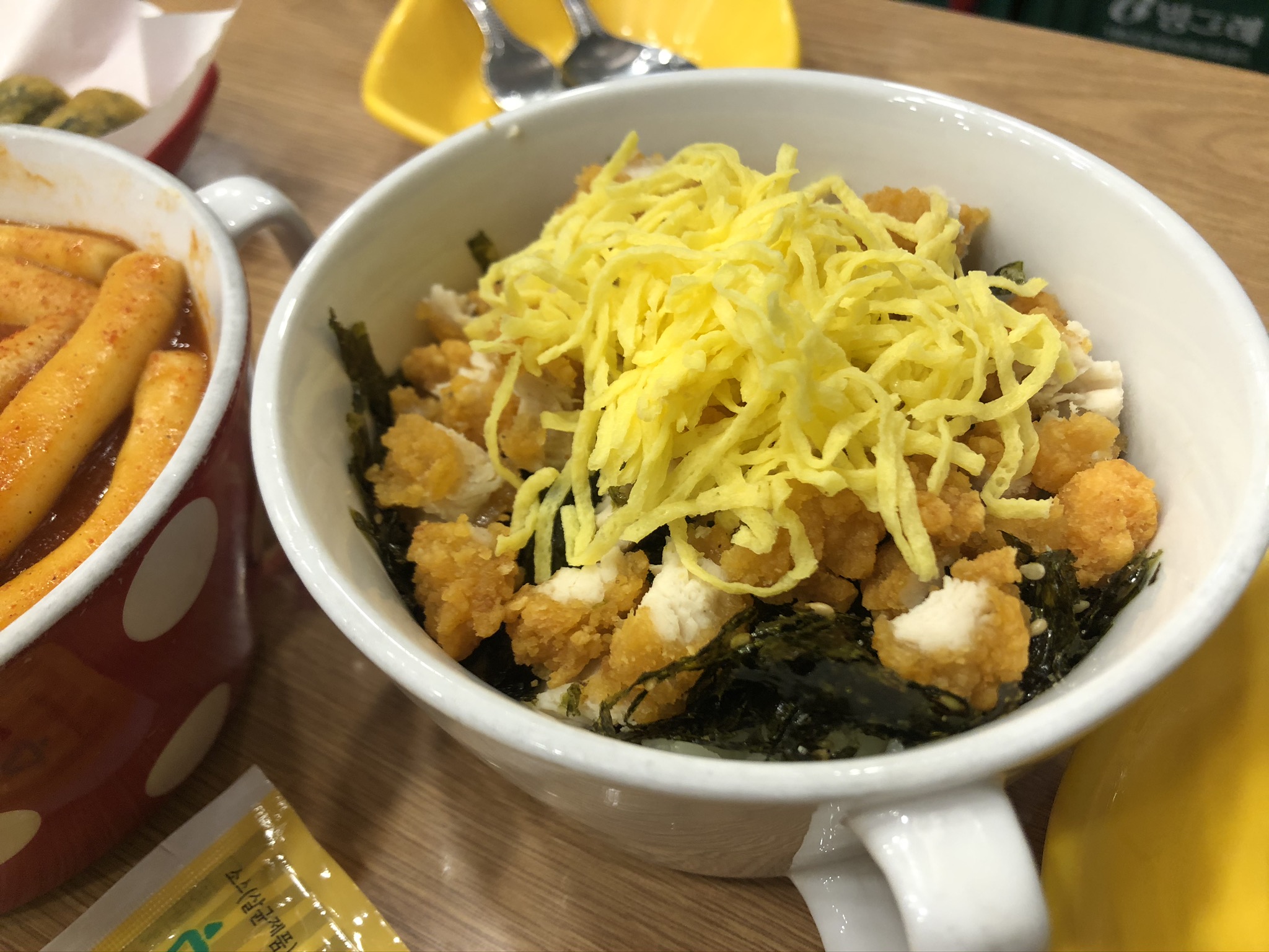 - 치킨마요 컵밥(3500원) 주문. 마요소스와 간장소스가 함께 나옴.