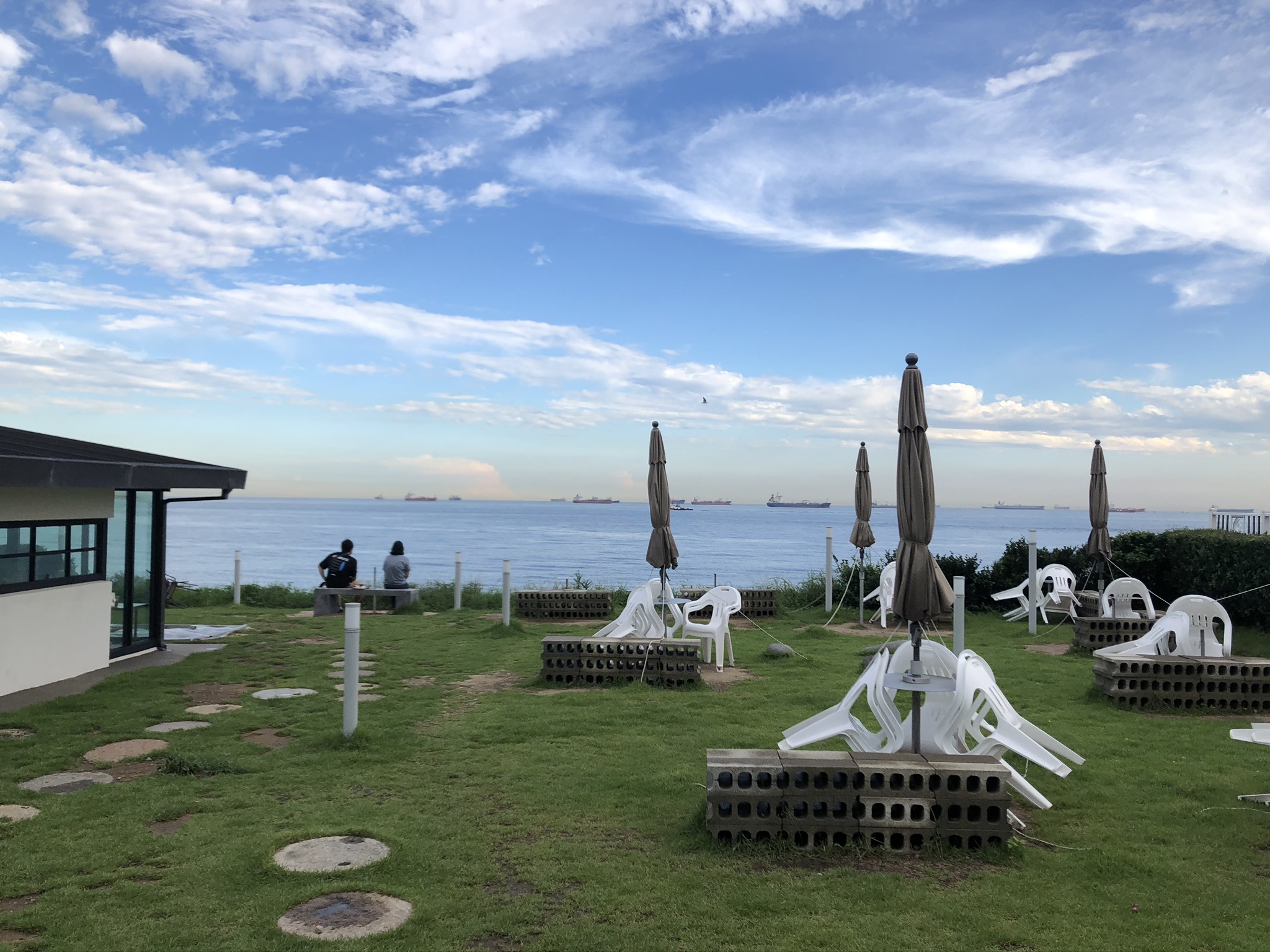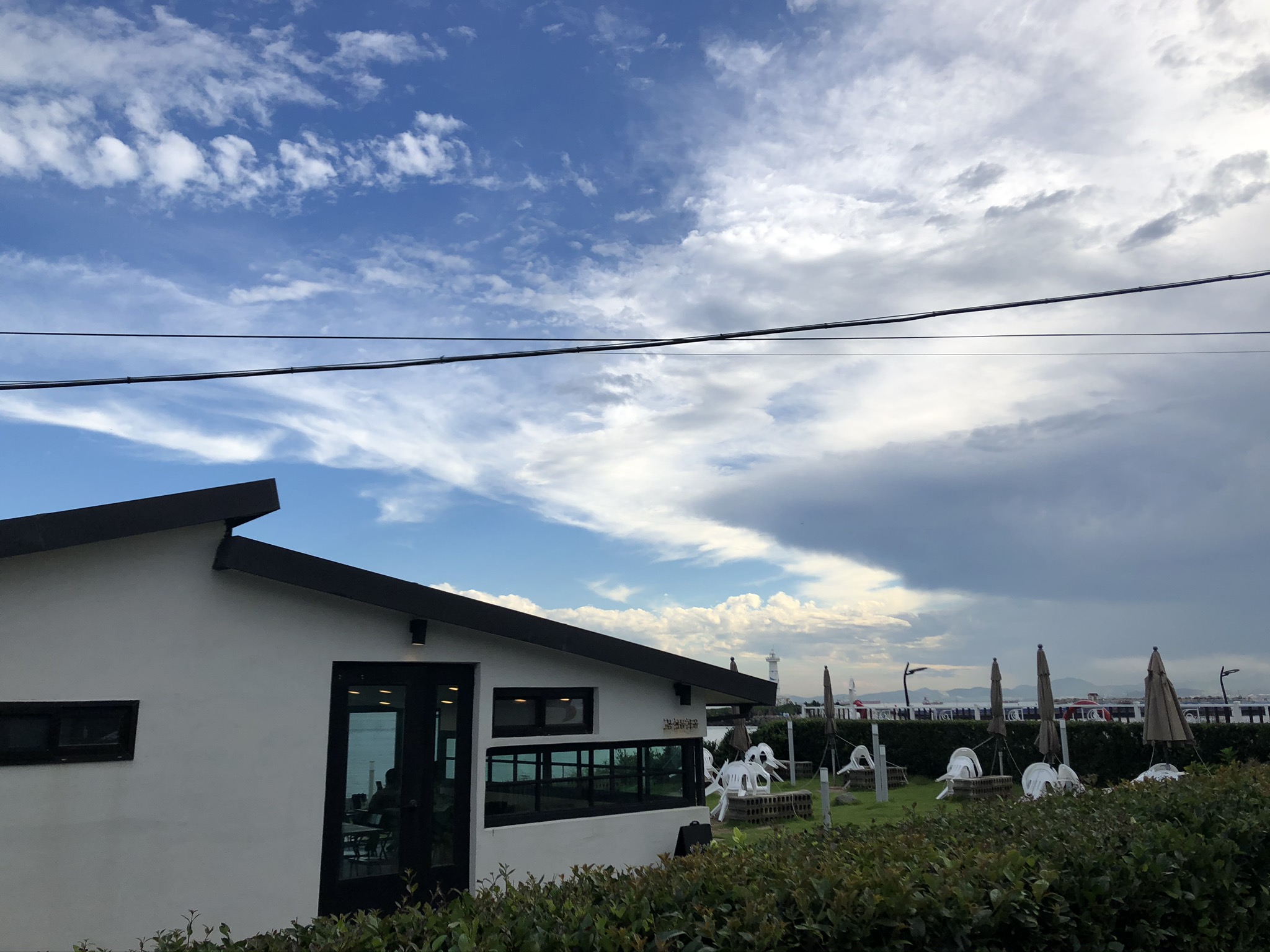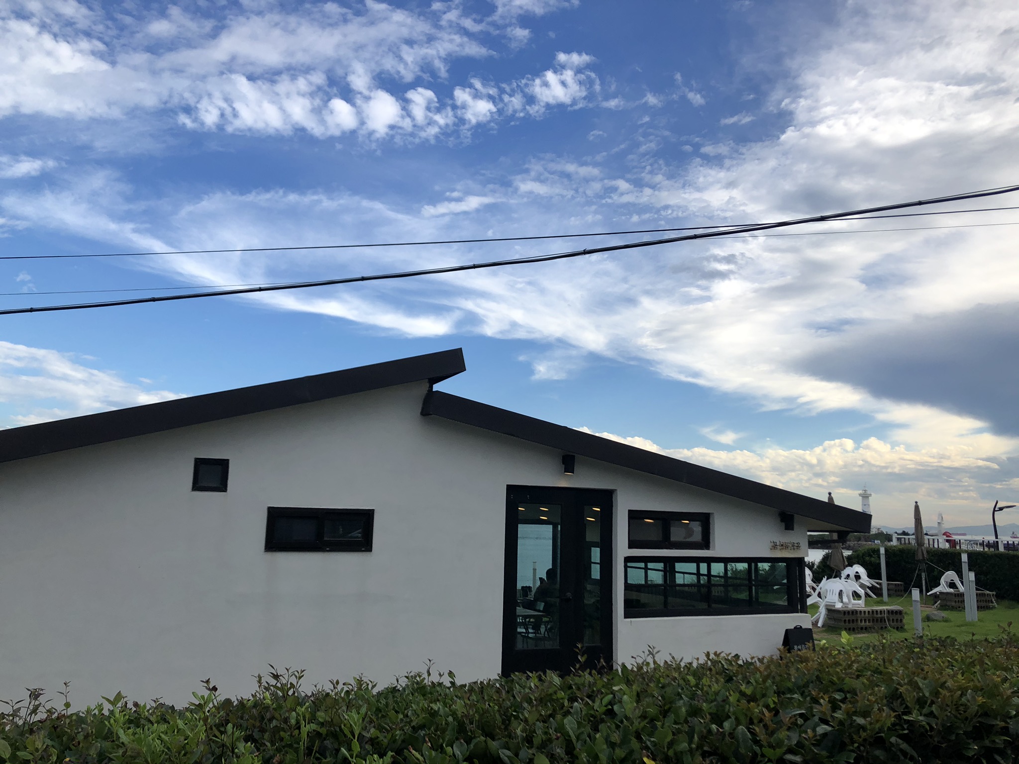 낮고 독특하게 지어진 단독 건물로 하늘두 바다두 어깨동무 하고있는 느낌