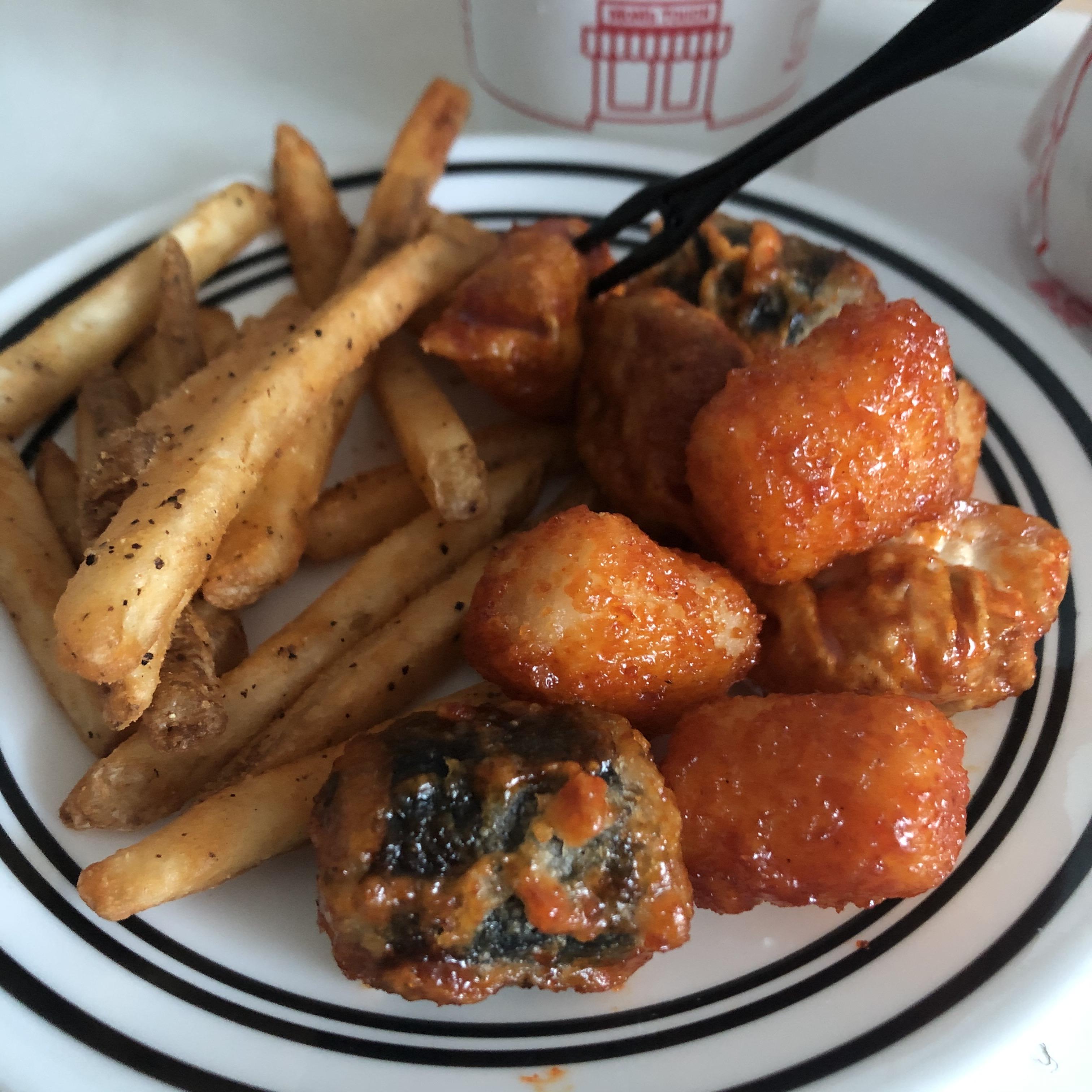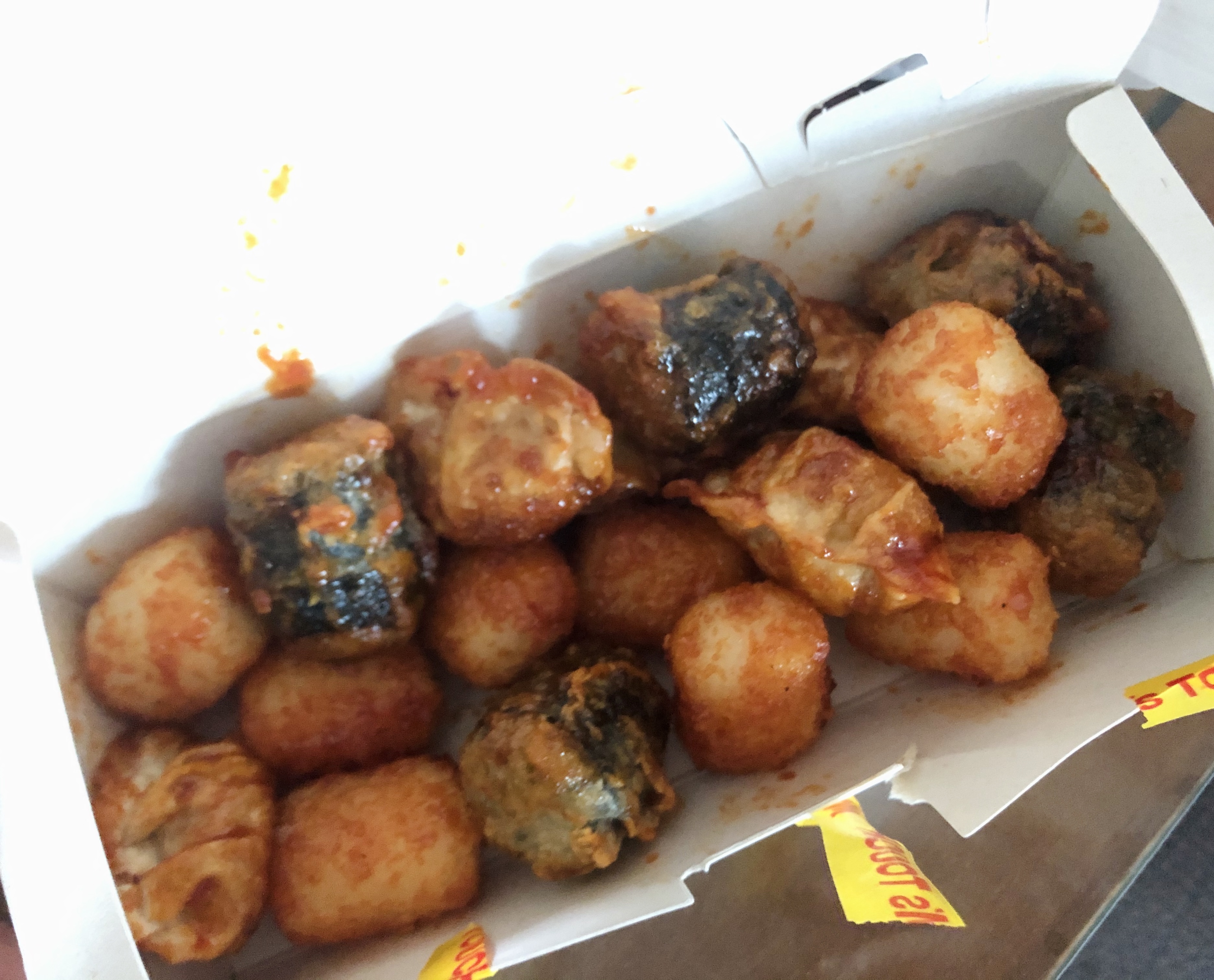 한번 튀겨낸 떡(어릴 적 떡꼬치를 생각하면 될듯!!!) 그리고 겁나 귀여운 작은 팝콘만두가 섞여 있다.
