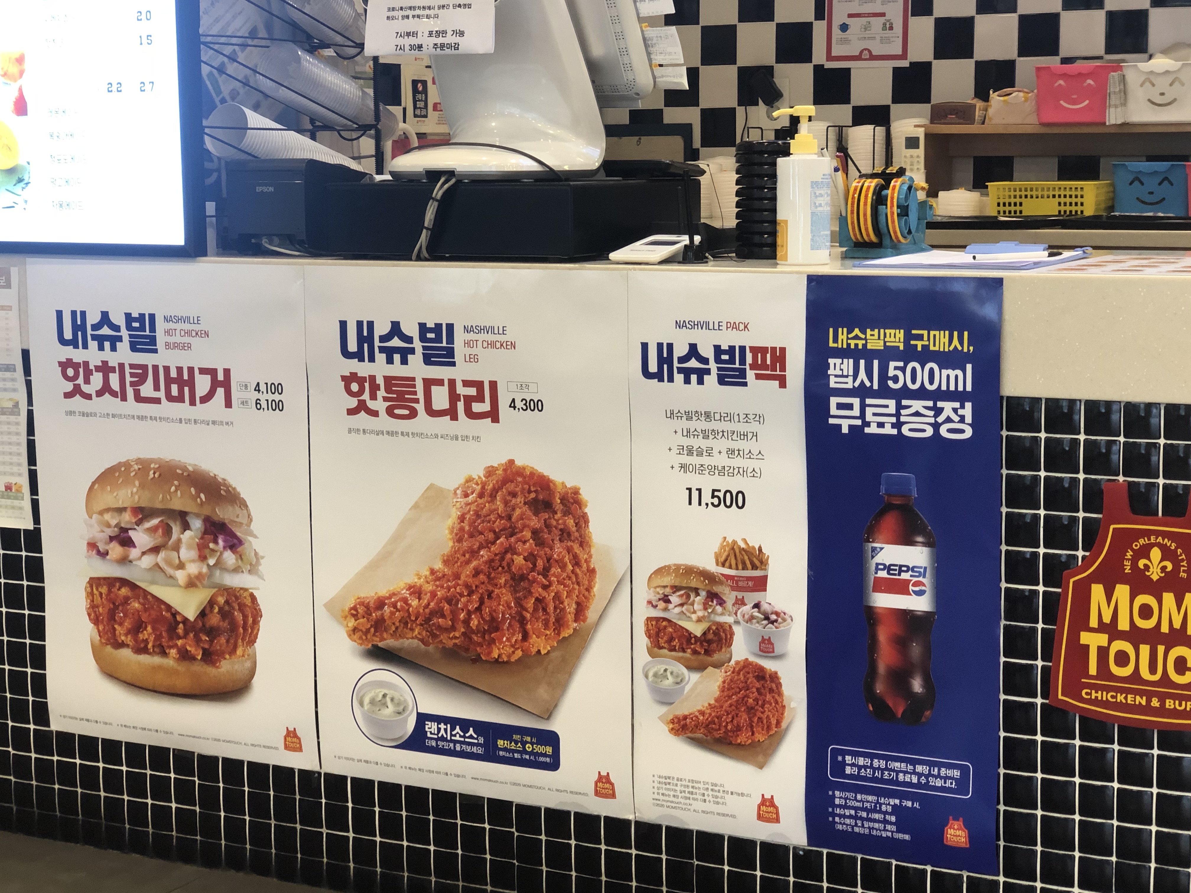 지금 맘스터치에서는 내슈빌 핫치킨버거, 내슈빌 핫통다리, 내슈빌 팩을 밀고 있는 것 같다.
